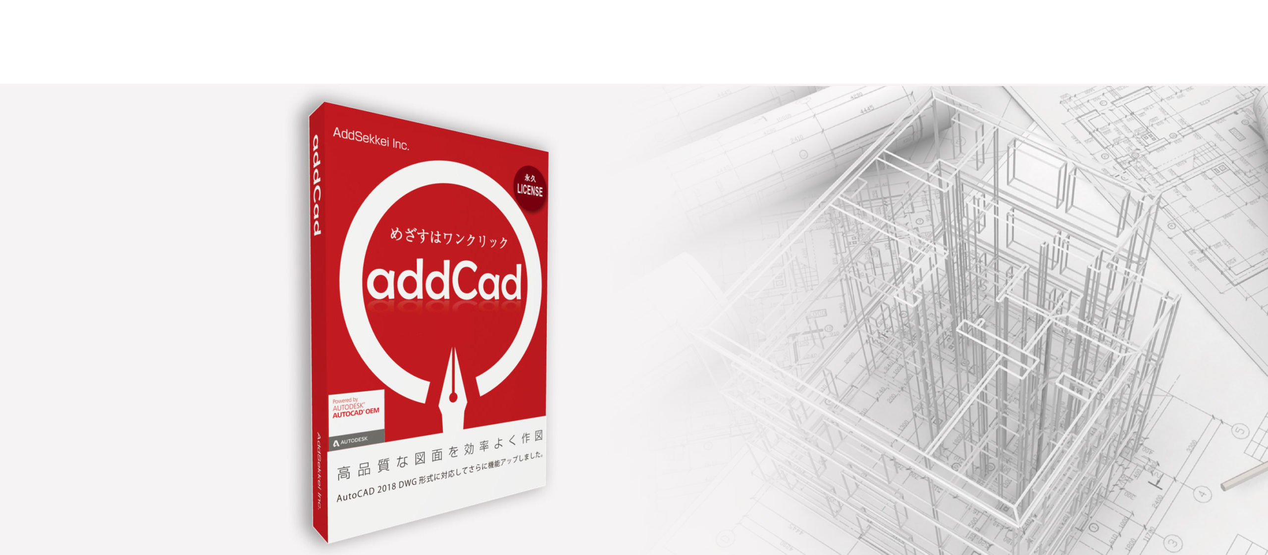 addCad® 24 | ¥217,800(税込)永久ライセンス 年間サポート料 ¥16,500 (初年度は無料) | 2D ソフトウェアを使用して、詳細設計ができます。建築設計に関しては専用コマンドを用意しています。特にRevitの2D図面作成を支援する機能を拡充させています。 3D モデリングおよびビジュアライゼーション機能を追加しました。ソリッド、サーフェス、メッシュ モデリング・3D ナビゲーション・表示スタイル・断面・レンダリング機能があります。 ※ addCadで使用できないAutoCADの機能があります。 ・ExpressTool ・LISPやVBAなどのプログラムによるカスタマイズ機能 ・AutoCAD Web(旧称 AutoCAD Web アプリ、AutoCAD Mobile アプリ) ・CAD標準仕様、ベースビュー、点群、地理的位置機能 ・他 |